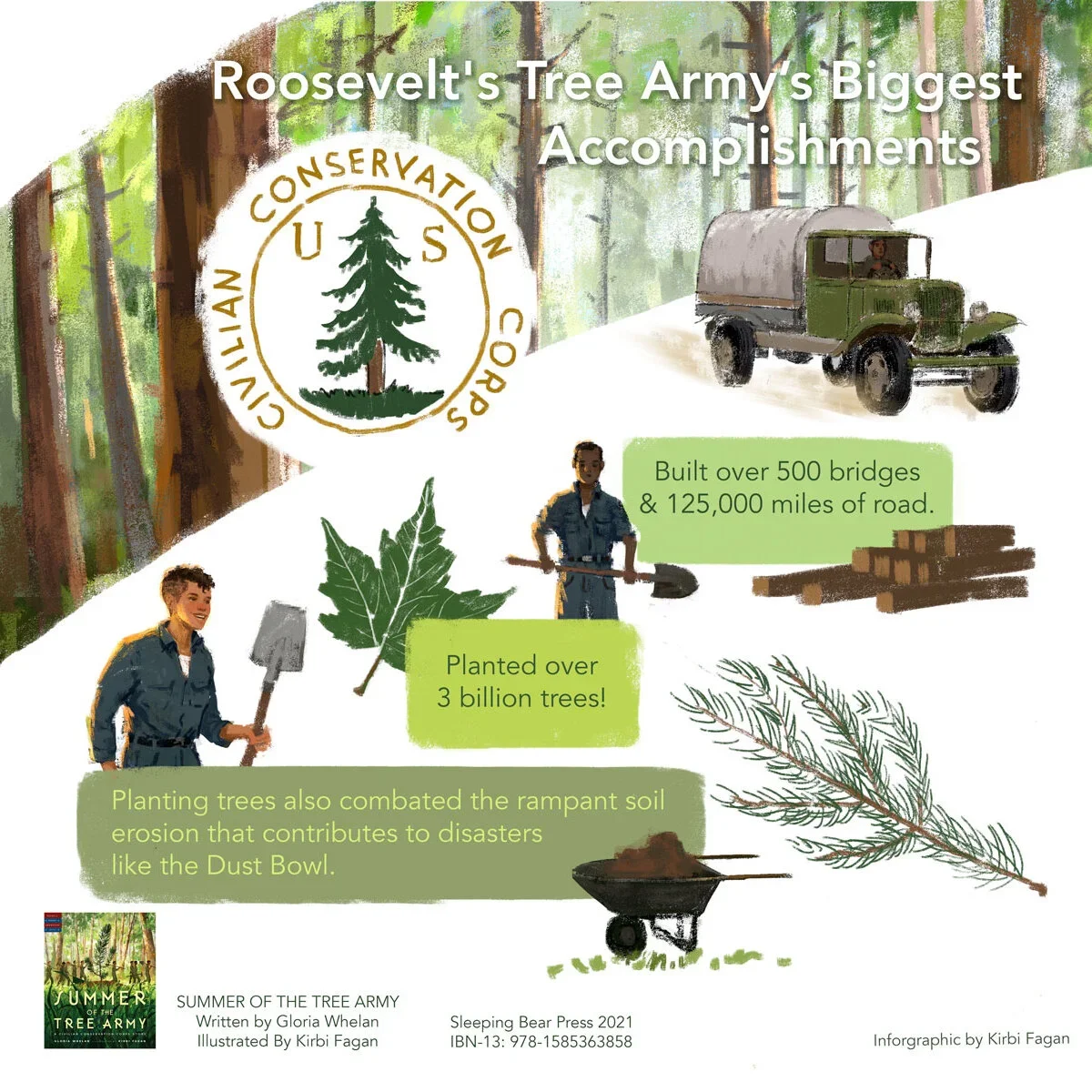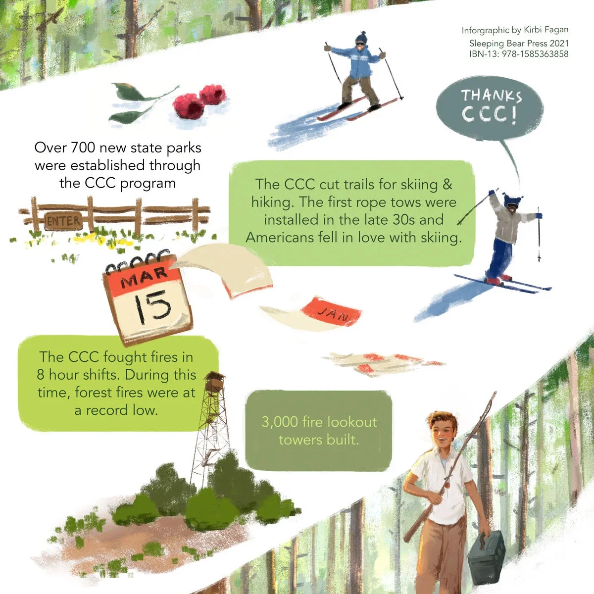 This book explores the Civilian Conservation Corps (CCC). This program helped shape and protect many of our national parks during the 1930s, showing how people have historically worked to protect and restore land. It follows a boy named Charlie in northern Michigan who learns about the work of the CCC as they help in forest conservation, planting trees, building infrastructure, and fighting fire.